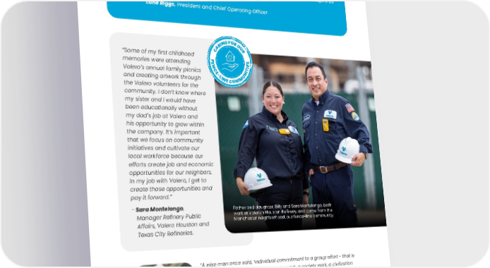 ENVIRONMENTAL, SOCIAL AND GOVERNANCE REPORT • 81 SAFETY COMMUNITY PEOPLE GOVERNANCE ENVIRONMENT “It is our emphasis on safety, teamwork, excellence and accountability that makes us a leader in the industry. But it is our commitment to doing the right thing and caring for our employees, our partners and communities that inspire us to excel.” - Lane Riggs , President and Chief Operating Officer “A wise man once said, ‘Individual commitment to a group effort - that is what makes a team work, a company work, a society work, a civilization work’... this is what makes Valero work! When you hear ‘COMMITMENT TO EXCELLENCE’ and ‘SAFETY IS OUR PRIORITY,’ it’s all about team effort. Teamwork and accountability to each other are what make those things actionable. Valero’s strong cultural values and everyone’s alignment with those values are what makes us special.” - Jimmy Fulbright , Lead Process Technician, Valero Corpus Christi Refinery. “Some of my first childhood memories were attending Valero’s annual family picnics and creating artwork through the Valero volunteers for the community. I don’t know where my sister and I would have been educationally without my dad’s job at Valero and his opportunity to grow within the company. It’s important that we focus on community initiatives and cultivate our local workforce because our efforts create job and economic opportunities for our neighbors. In my job with Valero, I get to create those opportunities and pay it forward.” - Sara Montelongo , Manager Refinery Public Affairs, Valero Houston and Texas City Refineries. Father and daughter, Billy and Sara Montelongo, both work at Valero’s Houston Refinery, and come from the Manchester neighborhood, our fence-line community. C A R I N G F O R O U R F E N C E - L I N E C O M M U N I T I E S C A R I N G F O R O U R F E N C E - L I N E C O M M U N I T I E S