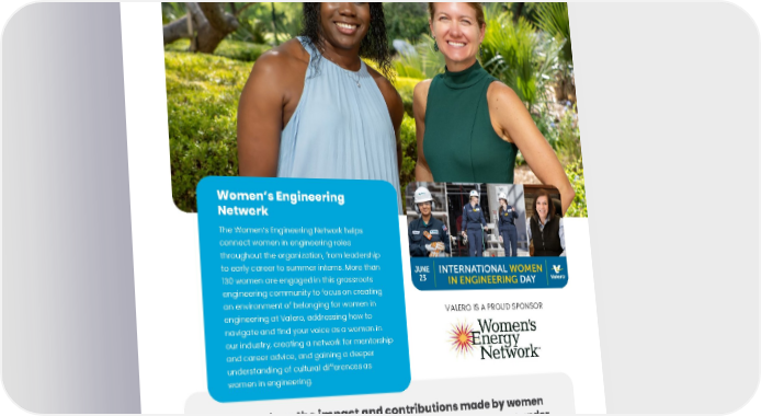 ENVIRONMENTAL, SOCIAL AND GOVERNANCE REPORT • 93 SAFETY COMMUNITY PEOPLE GOVERNANCE ENVIRONMENT Valero values the impact and contributions made by women throughout our company. We continue to improve our gender demographics. Since 2018: EXECUTIVE LEADERSHIP 11% TO 15% 36% PEOPLE LEADERS 18% TO 20% 11% ENGINEERING 17% TO 20% 18% Jill Burns , Director Technology, and Pam Jackson , Manager Regional Optimization Planning, provide leadership for the Women’s Engineering Network Women’s Engineering Network The Women’s Engineering Network helps connect women in engineering roles throughout the organization, from leadership to early career to summer interns. More than 130 women are engaged in this grassroots engineering community to focus on creating an environment of belonging for women in engineering at Valero, addressing how to navigate and find your voice as a woman in our industry, creating a network for mentorship and career advice, and gaining a deeper understanding of cultural differences as women in engineering. VALERO IS A PROUD SPONSOR