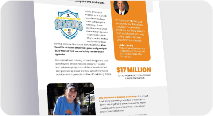 72 Since 1980, Valero has contributed more than $236 million to 59 United Way affiliates in 26 states across America where Valero employees live and work. Valero employees stepped up in 2021 with record contributions to our companywide campaign. These donations ensure that thousands of agencies supported by United Way have the funding needed to continue serving communities across the United States. More than 25% of Valero employees generously pledged 2% or more of their annual salary to United Way agencies . Our commitment to being a United Way partner also goes beyond direct employee pledging – we also lead volunteer projects in collaboration with United Way partners agencies and host special events and activities which generate additional fundraising dollars. Our Employees are Champions of United Way “In a year of challenges, employee contributions provided hope to the children, families, seniors and individuals who rely on the United Way at critical times of need.” - John Locke , Valero’s Vice President and Treasurer and Chair of the 2021 Valero United Way Campaign. $17 MILLION TOTAL VALERO UNITED WAY PLEDGE CAMPAIGN FOR 2021 BBQ Showdown in Ardmore, Oklahoma – This annual fundraising event brings members of the Ardmore community together to generate one of the largest donations of the year to benefit the United Way of South-Central Oklahoma. In 2021, there were 39 participating teams and over 60 sponsors of the event, raising a total of $220,431. The two-day event has become a southern Oklahoma tradition, bringing thousands to the area to enjoy some amazing BBQ while contributing to a great cause.