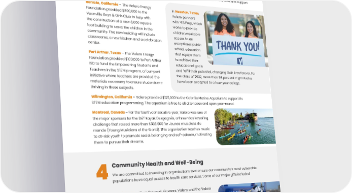 64 Education and Workforce Development Every child deserves access to the resources and technology that engage them fully and maximize their learning experience. Valero partners with local public school districts and foundations, charter schools, colleges, universities and trade schools to ensure all students have access to the tools and support systems needed to pursue their dreams. Benicia, California – The Valero Energy Foundation provided $500,000 to the Vacaville Boys & Girls Club to help with the construction of a new 8,000 square foot building to serve the children in the community. The new building will include classrooms, a new kitchen and a celebration center. Port Arthur, Texas – The Valero Energy Foundation provided $100,000 to Port Arthur ISD to fund the Empowering Students and Teachers in the STEM program, a four-part initiative where teachers are provided the materials necessary to ensure students are thriving in these subjects. 2 Wilmington, California – Valero provided $125,000 to the Cabrillo Marine Aquarium to support its STEM education programming. The aquarium is free to all attendees and open year-round. Montreal, Canada – For the fourth consecutive year, Valero was one of the major sponsors for the Défi Kayak Desgagnés, a three-day kayaking challenge that raised more than $333,000 for Jeunes musiciens du monde (Young Musicians of the World). This organization teaches music to at-risk youth to promote social belonging and self-esteem, motivating them to pursue their dreams. In Houston, Texas , Valero partners with YES Prep, which works to provide children equitable access to an exceptional public school education that equips them to achieve their educational goals and fulfill their potential, changing their lives forever. For the class of 2022, more than 98 percent of graduates have been accepted to a four-year college. Corpus Christi, Texas – Over the past six years, Valero and the Valero Energy Foundation have provided around $1.5 million to Driscoll Children’s Hospital in South Texas, which provides pediatric care for 31-counties. In 2021, Valero’s support helped the Hospital raise $81,000 to purchase “Transportle Preemie Pods” to keep tiny patients secured during transport. Community Health and Well-Being We are committed to investing in organizations that ensure our community’s most vulnerable populations have equal access to health care services. Some of our major gifts included: 4