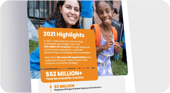 62 Community Investment Impact 2021 Highlights In 2021, Valero and the Valero Energy Foundation generated more than $62 million for charities through employee and company donations, corporate philanthropy, fundraising and volunteerism. More than 616 nonprofit organizations were supported through Valero’s diverse and inclusive community strategy. $3 MILLION Employee Giving and Global Employee Volunteerism $16 MILLION Corporate Investments in the U.S., U.K., Canada, Mexico and Peru $17 MILLION Support of United Way across the U.S. $27 MILLION Valero Energy Foundation Investments (Including proceeds from the Valero Texas Open and Benefit for Children) $62 MILLION+ Total Generated for Charities