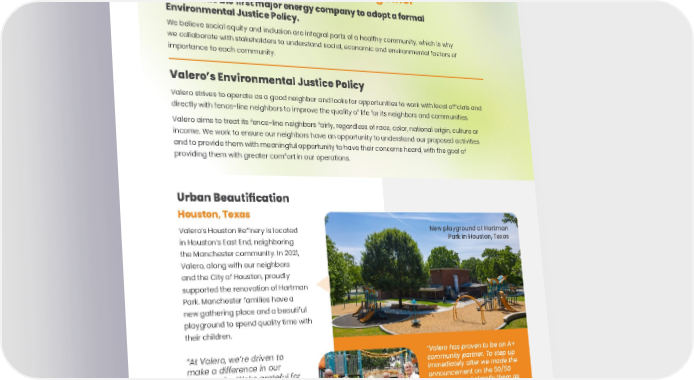 58 58 Urban Beautification Houston, Texas Valero’s Houston Refinery is located in Houston’s East End, neighboring the Manchester community. In 2021, Valero, along with our neighbors and the City of Houston, proudly supported the renovation of Hartman Park. Manchester families have a new gathering place and a beautiful playground to spend quality time with their children. Valero’s Environmental Justice Policy Valero strives to operate as a good neighbor and looks for opportunities to work with local officials and directly with fence-line neighbors to improve the quality of life for its neighbors and communities. Valero aims to treat its fence-line neighbors fairly, regardless of race, color, national origin, culture or income. We work to ensure our neighbors have an opportunity to understand our proposed activities and to provide them with meaningful opportunity to have their concerns heard, with the goal of providing them with greater comfort in our operations. Advancing Social Equity and Inclusion to Build Stronger Communities - Together Valero was the first major energy company to adopt a formal Environmental Justice Policy. We believe social equity and inclusion are integral parts of a healthy community, which is why we collaborate with stakeholders to understand social, economic and environmental factors of importance to each community. “At Valero, we’re driven to make a difference in our community. We’re grateful for the opportunity to join Mayor Turner and the other partners to create a lasting difference in the lives of our neighbors and provide families a fun, safe and attractive park.” - Lon Brenner , Vice President and General Manager, Valero Houston Refinery “Valero has proven to be an A+ community partner. To step up immediately after we made the announcement on the 50/50 Park Initiative, I classify them as an outstanding corporate citizen, and the investment they made is now benefiting these kids and sending a very important message to our city.” - Sylvester Turner, Houston Mayor New playground at Hartman Park in Houston, Texas