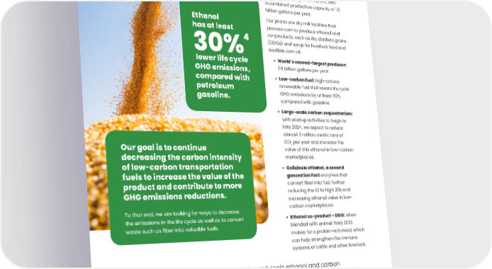 ENVIRONMENTAL, SOCIAL AND GOVERNANCE REPORT • 21 SAFETY COMMUNITY PEOPLE GOVERNANCE ENVIRONMENT Ethanol Our ethanol business began in 2009 and includes 12 plants, located in the Mid-Continent region of the U.S., with a combined production capacity of 1.6 billion gallons per year. Our plants are dry mill facilities that process corn to produce ethanol and co-products, such as dry distillers grains (DDGs) and syrup for livestock feed and inedible corn oil. • World’s second-largest producer: 1.6 billion gallons per year. • Low-carbon fuel: high-octane renewable fuel that lowers life cycle GHG emissions by at least 30%, compared with gasoline. • Large-scale carbon sequestration: with startup activities to begin in late 2024, we expect to reduce almost 3 million metric tons of CO 2 per year and increase the value of this ethanol in low-carbon marketplaces. • Cellulosic ethanol, a second generation fuel: enzymes that convert fiber into fuel, further reducing the CI to high 20s and increasing ethanol value in low- carbon marketplaces. • Ethanol co-product - DDG: when blended with animal feed, DDG makes for a protein-rich meal, which can help strengthen the immune systems of cattle and other livestock. Our goal is to continue decreasing the carbon intensity of low-carbon transportation fuels to increase the value of the product and contribute to more GHG emissions reductions. To that end, we are looking for ways to decrease the emissions in the life cycle as well as to convert waste such as fiber into valuable fuels. "When you combine cellulosic ethanol and carbon sequestration, ethanol sold to low-carbon markets could offer much lower GHG emissions than EVs. The carbon intensity of such ethanol could be in the single digits." - Eric Honeyman , Vice President - Renewables Operations and Low Carbon Fuels Ethanol has at least 30% 4 lower life cycle GHG emissions, compared with petroleum gasoline. 4 The carbon intensity of our ethanol can be further reduced to single digits with carbon sequestration and fiber ethanol production.
