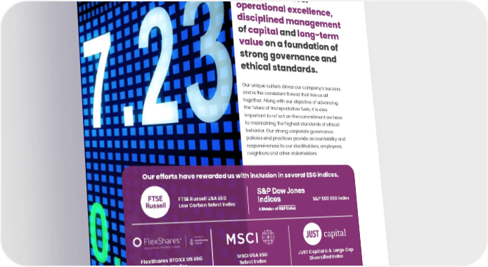 ENVIRONMENTAL, SOCIAL AND GOVERNANCE REPORT • 97 We view our stakeholders as partners to whom we seek to deliver operational excellence, disciplined management of capital and long-term value on a foundation of strong governance and ethical standards. Our unique culture drives our company’s success and is the consistent thread that ties us all together. Along with our objective of advancing the future of transportation fuels, it is also important to reflect on the commitment we have to maintaining the highest standards of ethical behavior. Our strong corporate governance policies and practices provide accountability and responsiveness to our stockholders, employees, neighbors and other stakeholders. Our efforts have rewarded us with inclusion in several ESG indices. S&P 500 ESG Index MSCI USA ESG Select Index FlexShares STOXX US ESG Select Index FTSE Russell USA ESG Low Carbon Select Index JUST Capital U.S. Large Cap Diversified Index SSGA Gender Diversity Index Morningstar Developed Markets Paris Aligned Benchmark Index Northern Trust ESG & Climate US Large Cap Core Index
