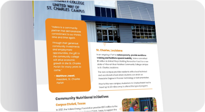 ENVIRONMENTAL, SOCIAL AND GOVERNANCE REPORT • 61 SAFETY COMMUNITY PEOPLE GOVERNANCE ENVIRONMENT St. Charles, Louisiana In an ongoing effort to reduce poverty, provide workforce training and facilitate upward mobility , Valero committed $1 million to United Way’s Building Renovation Fund for a new state-of-the-art River Parishes Community College campus in St. Charles, Louisiana. The new campus provides residents with a local technical and vocational school where students can attain an Associate Degree in Process Technology or Instrumentation. Prior to this new campus, students in St. Charles Parish had to travel up to 20 miles away to attend this type of program. “Valero is a community partner that demonstrates commitment to our Parish, time and time again. Through their generous community investments and employment opportunities, the gift to the community college will drive economic growth in the St. Charles Parish for many years to come.” - Matthew Jewell , President, St. Charles Parish Community Nutritional Initiatives Corpus Christi, Texas In 2021, the Valero Energy Foundation provided $1.5 million to the Coastal Bend Food Bank in Corpus Christi, Texas, to support the construction of a new 108,000 square foot distribution center to service an 11-county area. The new center is currently under construction with a targeted opening date in the summer of 2023. “I could not imagine having to run a nonprofit without companies like Valero. There is just no way we could do it. They are vital to our survival.” - Bea Hanson , Executive Director, Coastal Bend Food Bank