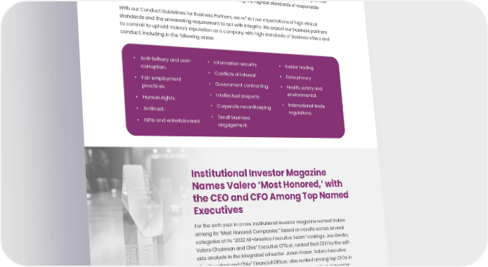 106 Supply Chain and Business Partners In 2021, Valero spent approximately $1.8 billion on sustaining and growth projects. Our business partners are critical to our success and reliability. We work collaboratively to promote optimal performance and mutual success by embracing the highest standards of responsible operations. With our Conduct Guidelines for Business Partners, we reflect our expectations of high ethical standards and the unwavering requirement to act with integrity. We expect our business partners to commit to uphold Valero’s reputation as a company with high standards of business ethics and conduct, including in the following areas: • Anti-bribery and anti- corruption. • Fair employment practices. • Human rights. • Antitrust. • Gifts and entertainment. Institutional Investor Magazine Names Valero ‘Most Honored,’ with the CEO and CFO Among Top Named Executives For the sixth year in a row, Institutional Investor magazine named Valero among its “Most Honored Companies,” based on results across several categories of its “2022 All-America Executive Team” rankings. Joe Gorder, Valero Chairman and Chief Executive Officer, ranked Best CEO by the sell- side analysts in the integrated oil sector. Jason Fraser, Valero Executive Vice President and Chief Financial Officer, also ranked among top CFOs in the integrated oil sector. Homer Bhullar, Valero Vice President of Investor Relations and Finance, ranked Best IR professional by sell-side analysts in the integrated oil sector. Valero ranked among top-two overall (buy-side and sell-side analysts combined) for Best IR Team, IR Program, ESG, and Crisis Management of COVID-19 categories. • Information security. • Conflicts of interest. • Government contracting. • Intellectual property. • Corporate recordkeeping. • Small business engagement. • Insider trading. • Data privacy. • Health, safety and environmental. • International trade regulations. See page 111 for notes regarding this page and for non-GAAP disclosures.