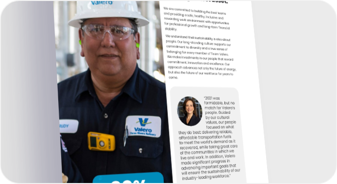 ENVIRONMENTAL, SOCIAL AND GOVERNANCE REPORT • 77 Our people are our competitive advantage and our greatest asset. We are committed to building the best teams and providing a safe, healthy, inclusive and rewarding work environment with opportunities for professional growth and long-term financial stability. We understand that sustainability is also about people. Our long-standing culture supports our commitment to diversity and a true sense of belonging for every member of Team Valero. We make investments in our people that reward commitment, innovation and excellence. Our approach advances not only the future of energy, but also the future of our workforce for years to come. “2021 was formidable, but no match for Valero’s people. Guided by our cultural values, our people focused on what they do best: delivering reliable, affordable transportation fuels to meet the world’s demand as it recovered, while taking great care of the communities in which we live and work. In addition, Valero made significant progress in advancing important goals that will ensure the sustainability of our industry-leading workforce.” - Julia Rendon Reinhart , Senior Vice President and Chief Human Resources Officer 88% of Valero employees “recommend Valero as a great place to work”