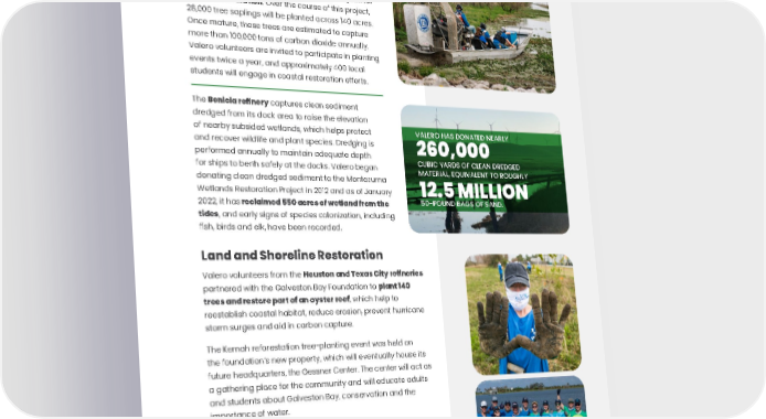 34 Land and Shoreline Restoration Valero volunteers from the Houston and Texas City refineries partnered with the Galveston Bay Foundation to plant 140 trees and restore part of an oyster reef , which help to reestablish coastal habitat, reduce erosion, prevent hurricane storm surges and aid in carbon capture. The Kemah reforestation tree-planting event was held on the foundation’s new property, which will eventually house its future headquarters, the Gessner Center. The center will act as a gathering place for the community and will educate adults and students about Galveston Bay, conservation and the importance of water. Approximately 7,500 pounds of oyster shells were collected from local restaurants, bundled into sacks, and placed along the Galveston Bay shoreline to restore 38 feet of oyster reef. Oyster reefs help filter water and prevent storm surges, provide a nursery for oyster larvae and other marine animals, and allow sediment to settle along the shoreline, helping to restore coastal habitats. Wetlands Restoration The St. Charles refinery continued its longstanding partnership with the Pontchartrain Conservancy with a $1 million contribution to fund a five-year plan for wetland restoration . Over the course of this project, 28,000 tree saplings will be planted across 140 acres. Once mature, these trees are estimated to capture more than 100,000 tons of carbon dioxide annually. Valero volunteers are invited to participate in planting events twice a year, and approximately 400 local students will engage in coastal restoration efforts. The Benicia refinery captures clean sediment dredged from its dock area to raise the elevation of nearby subsided wetlands, which helps protect and recover wildlife and plant species. Dredging is performed annually to maintain adequate depth for ships to berth safely at the docks. Valero began donating clean dredged sediment to the Montezuma Wetlands Restoration Project in 2012 and as of January 2022, it has reclaimed 550 acres of wetland from the tides , and early signs of species colonization, including fish, birds and elk, have been recorded. VALERO HAS DONATED NEARLY 260,000 CUBIC YARDS OF CLEAN DREDGED MATERIAL, EQUIVALENT TO ROUGHLY 12.5 MILLION 50-POUND BAGS OF SAND.