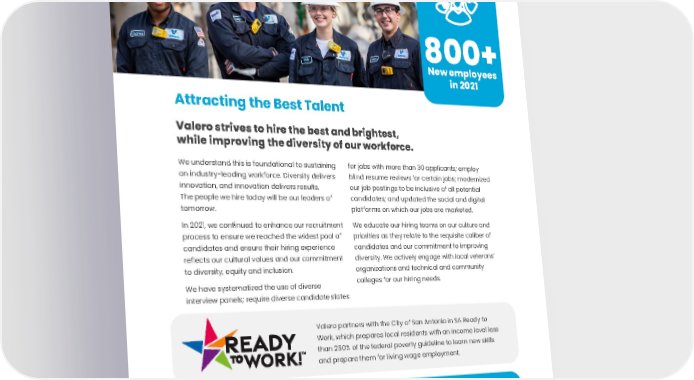 82 Attracting the Best Talent Valero strives to hire the best and brightest, while improving the diversity of our workforce. 800+ New employees in 2021 Valero partners with the City of San Antonio in SA Ready to Work, which prepares local residents with an income level less than 250% of the federal poverty guideline to learn new skills and prepare them for living wage employment. We understand this is foundational to sustaining an industry-leading workforce. Diversity delivers innovation, and innovation delivers results. The people we hire today will be our leaders of tomorrow. In 2021, we continued to enhance our recruitment process to ensure we reached the widest pool of candidates and ensure their hiring experience reflects our cultural values and our commitment to diversity, equity and inclusion. We have systematized the use of diverse interview panels; require diverse candidate slates for jobs with more than 30 applicants; employ blind resume reviews for certain jobs; modernized our job postings to be inclusive of all potential candidates; and updated the social and digital platforms on which our jobs are marketed. We educate our hiring teams on our culture and priorities as they relate to the requisite caliber of candidates and our commitment to improving diversity. We actively engage with local veterans’ organizations and technical and community colleges for our hiring needs. DEI at Valero Diversity, Equity and Inclusion is not a standalone activity or program at Valero. It is embedded in our cultural values. It is integrated into every process and mechanism that impacts our recruitment activities and our employees. In these pages, you will see aspects of our commitment to build more diverse teams and ensure an authentic sense of belonging to support inclusion in our workforce and in everything we do.
