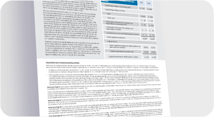 ENVIRONMENTAL, SOCIAL AND GOVERNANCE REPORT • 111 Capital investments attributable to Valero Capital investments attributable to Valero is a non-GAAP financial measure that reflects our net share of capital investments and is defined as all capital expenditures, deferred turnaround and catalyst cost expenditures, and investments in nonconsolidated joint ventures, excluding the portion of DGD’s capital investments attributable to the other joint venture member and all of the capital expenditures of other consolidated variable interest entities (VIEs). We are a 50 percent joint venture member in DGD and consolidate its financial statements. As a result, all of DGD’s net cash provided by operating activities (or operating cash flow) is included in our consolidated net cash provided by operating activities. DGD’s members use DGD’s operating cash flow (excluding changes in its current assets and current liabilities) to fund its capital investments rather than distribute all of that cash to themselves. Because DGD’s operating cash flow is effectively attributable to each member, only 50 percent of DGD’s capital investments should be attributed to our net share of capital investments. We also exclude all of the capital expenditures of other VIEs that we consolidate because we do not operate those VIEs. We believe capital investments attributable to Valero is an important measure because it more accurately reflects our capital investments. Capital investments attributable to Valero should not be considered as an alternative to capital investments, which is the most comparable GAAP measure, nor should it be considered in isolation or as a substitute for an analysis of our cash flows as reported under GAAP. In addition, this non-GAAP measure may not be comparable to similarly titled measures used by other companies because we may define it differently, which may diminish its utility. Reconciliation of Total Capital Investments to Capital Investments Attributable to Valero (in millions) 2021 2020 Capital expenditures (excluding VIEs) $ 513 $ 1,014 Capital expenditures of VIEs: DGD $ 1,042 $ 523 Other VIEs $ 110 $ 251 Deferred turnaround and catalyst cost expenditures (excluding VIEs) $ 787 $ 623 Deferred turnaround and catalyst cost expenditures of DGD $ 6 $ 25 Investments in nonconsolidated joint ventures $ 9 $ 54 Total capital investments $ 2,467 $ 2,490 Adjustments: DGD's capital investments attributable to our joint venture member $ (524) $ (274) Capital expenditures of other VIEs $ (110) $ (251) Capital investments attributable to Valero $ 1,833 $ 1,965 Adjusted Net Cash Provided by Operating Activities Defined as net cash provided by operating activities excluding the items noted below . Valero believes adjusted net cash provided by operating activities is an important measure of its ongoing financial performance to better assess its ability to generate cash to fund Valero’s investing and financing activities. The basis for Valero’s belief with respect to each excluded item is provided below. • Changes in current assets and current liabilities – Current assets net of current liabilities represents Valero’s operating liquidity. Valero believes that the change in its operating liquidity from period to period does not represent cash generated by Valero’s operations that is available to fund Valero’s investing and financing activities. • DGD’s adjusted net cash provided by operating activities attributable to the other joint venture member’s ownership interest in DGD – Valero is a 50/50 joint venture member in DGD and consolidates DGD’s financial statements; as a result, all of DGD’s net cash provided by operating activities (or operating cash flow) is included in Valero’s consolidated net cash provided by operating activities. DGD’s members use DGD’s operating cash flow (excluding changes in its current assets and current liabilities) to fund its capital investments rather than distribute all of that cash to themselves. Nevertheless, DGD’s operating cash flow is effectively attributable to each member and only 50 percent of DGD’s operating cash flow should be attributed to Valero's net cash provided by operating activities. Therefore, net cash provided by operating activities has been adjusted for the portion of DGD’s operating cash flow attributable to the other joint venture member’s ownership interest because Valero believes that it more accurately reflects the operating cash flow available to Valero to fund Valero’s investing and financing activities. Notes from Page 9: Valero published the 2021 TCFD Report and Scenario Analysis following the recommendations of the Task Force on Climate-related Financial Disclosures (TCFD). A copy of this report is available on our website at www.valero.com > Investors > ESG. Valero uses third parties to conduct GHG emissions, carbon intensity and fuel compliance verifications. Governments across the world with cap-and-trade and low-carbon fuel policies that purchase our low-carbon fuels require independent third-party assurance of our GHG emissions and the carbon intensity of our products. For instance, California requires the mandatory verification of GHG emissions data reports as well as low-carbon fuels. Verification services are performed by qualified and trained third-party verifiers. We engaged Lloyd’s Register Quality Assurance Inc., an affiliate of Lloyd’s Register North America Inc., to evaluate and issue an assurance statement on the accuracy and reliability of our global refinery Scope 1 and 2 GHG emissions. Notes from Page 14: Southwest Research Institute Ted Talk, presented by Graham Conway. Life cycle emissions from EVs are significant from mining raw materials to fabrication to delivery to the showroom. Two times as much CO 2 emissions are generated compared to cars fueled by gasoline. Before it leaves the showroom, 12 tons of CO 2 emissions have already been generated vs. 6 tons of 