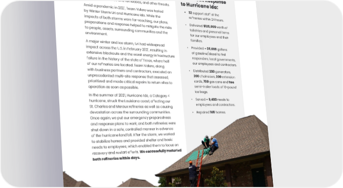 SAFETY COMMUNITY PEOPLE GOVERNANCE ENVIRONMENT ENVIRONMENTAL, SOCIAL AND GOVERNANCE REPORT • 53 2021 Emergency Response With refineries along coastlines and ethanol plants in the U.S. Midwest, Valero evaluates and prepares for physical risks to its facilities from natural disasters, including hurricanes and tornadoes, and other threats. Amid a pandemic in 2021, Team Valero was tested by Winter Storm Uri and Hurricane Ida. While the impacts of both storms were far-reaching, our plans, preparations and response helped to mitigate the risks to people, assets, surrounding communities and the environment. A major winter and ice storm, Uri had widespread impact across the U.S. in February 2021, resulting in extensive blackouts and the worst energy infrastructure failure in the history of the state of Texas, where half of our refineries are located. Team Valero, along with business partners and contractors, executed an unprecedented multi-site response that assessed, prioritized and made critical repairs to return sites to operation as soon as possible. In the summer of 2021, Hurricane Ida, a Category 4 hurricane, struck the Louisiana coast, affecting our St. Charles and Meraux refineries as well as causing devastation across the surrounding communities. Once again, we put our emergency preparedness and response plans to work, and both refineries were shut down in a safe, controlled manner in advance of the hurricane landfall. After the storm, we worked to stabilize homes and provided shelter and basic needs to employees, which enabled them to focus on recovery and restart efforts. We successfully restarted both refineries within days. First Week Response to Hurricane Ida: • 32 support staff at the refineries within 24 hours. • Delivered $125,000 worth of toiletries and personal items for our employees and their families. • Provided ~ 35,000 gallons of gasoline/diesel to first responders, local governments, our employees and contractors. • Distributed 200 generators, 200 chainsaws, 300 extension cords, 700 gas cans and two semi-trailer loads of 10-pound ice bags. • Served ~ 9,400 meals to employees and contractors. • Repaired 165 homes. ENVIRONMENTAL, SOCIAL AND GOVERNANCE REPORT • 53