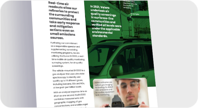 28 Leveraging Technologies to Reduce Emissions Real-time air readouts allow our refineries to protect the surrounding communities and take early response and mitigation actions even on small emissions sources. Furthering our commitment as a responsible operator and supplementing our existing monitoring programs, we are utilizing the Duvas DV3000, a real- time mobile air quality monitoring surveying system, for air quality screenings. The vehicle-mounted DV3000 is a gas analyzer that uses ultraviolet spectroscopy to identify and qualify up to 14 different gases, including benzene, SOx and NOx, at low part-per-billion levels. With an analyzer response time as short as one second, the DV3000 combines measurements with geographic mapping of gas concentrations, and enables rapid detection and source location of air emissions during monitoring. Anemometer: measures wind direction to locate the source of emissions Air sampler Valero refineries use optical gas imaging technology to detect VOC emissions and for routine equipment leak monitoring. DV3000 Mobile Air Quality Monitor In 2021, Valero undertook air quality screenings in our fence-line communities and verified all levels were under the applicable environmental standards. Watch a video about the DV3000 mobile air quality monitor.