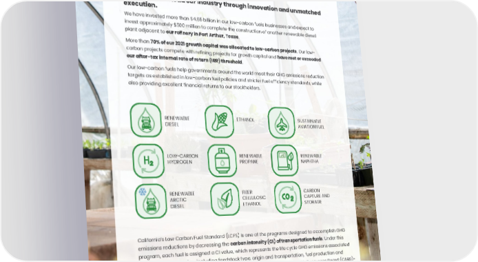 ENVIRONMENTAL, SOCIAL AND GOVERNANCE REPORT • 19 SAFETY COMMUNITY PEOPLE GOVERNANCE ENVIRONMENT 2 The LCFS verification program, under CARB oversight, provides confidence and reliability in reported data. Verification services are performed by qualified and trained third-party verifiers. Low-Carbon Fuels and Projects We continue to lead our industry through innovation and unmatched execution. We have invested more than $4.65 billion in our low-carbon fuels businesses and expect to invest approximately $500 million to complete the construction of another renewable diesel plant adjacent to our refinery in Port Arthur, Texas . More than 70% of our 2021 growth capital was allocated to low-carbon projects . Our low- carbon projects compete with refining projects for growth capital and have met or exceeded our after-tax internal rate of return (IRR) threshold . Our low-carbon fuels help governments around the world meet their GHG emissions reduction targets as established in low-carbon fuel policies and stricter fuel efficiency standards, while also providing excellent financial returns to our stockholders. California’s Low Carbon Fuel Standard (LCFS) is one of the programs designed to accomplish GHG emissions reductions by decreasing the carbon intensity (CI) of transportation fuels . Under this program, each fuel is assigned a CI value, which represents the life cycle GHG emissions associated with feedstock sourcing, including feedstock type, origin and transportation, fuel production and distribution, and the use of the fuel. CIs are determined using a California Air Resources Board (CARB)- developed GHG emissions model, and fuel pathway CIs are certified 2 by CARB after producers submit operational data to demonstrate the life cycle GHG emissions. RENEWABLE DIESEL ETHANOL SUSTAINABLE AVIATION FUEL LOW-CARBON HYDROGEN RENEWABLE PROPANE RENEWABLE NAPHTHA RENEWABLE ARCTIC DIESEL FIBER CELLULOSIC ETHANOL See page 111 for notes regarding this page and for non-GAAP disclosures. CARBON CAPTURE AND STORAGE