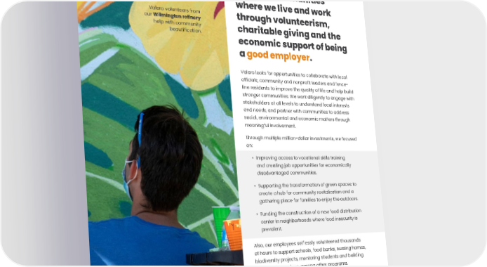 ENVIRONMENTAL, SOCIAL AND GOVERNANCE REPORT • 57 We will be a good neighbor by sharing our success with the communities where we live and work through volunteerism, charitable giving and the economic support of being a good employer . Valero looks for opportunities to collaborate with local officials, community and nonprofit leaders and fence- line residents to improve the quality of life and help build stronger communities. We work diligently to engage with stakeholders at all levels to understand local interests and needs, and partner with communities to address social, environmental and economic matters through meaningful involvement. Through multiple million-dollar investments, we focused on: • Improving access to vocational skills training and creating job opportunities for economically disadvantaged communities. • Supporting the transformation of green spaces to create a hub for community revitalization and a gathering place for families to enjoy the outdoors. • Funding the construction of a new food distribution center in neighborhoods where food insecurity is prevalent. Also, our employees selflessly volunteered thousands of hours to support schools, food banks, nursing homes, biodiversity projects, mentoring students and building community gardens, among other programs. Valero volunteers from our Wilmington refinery help with community beautification.