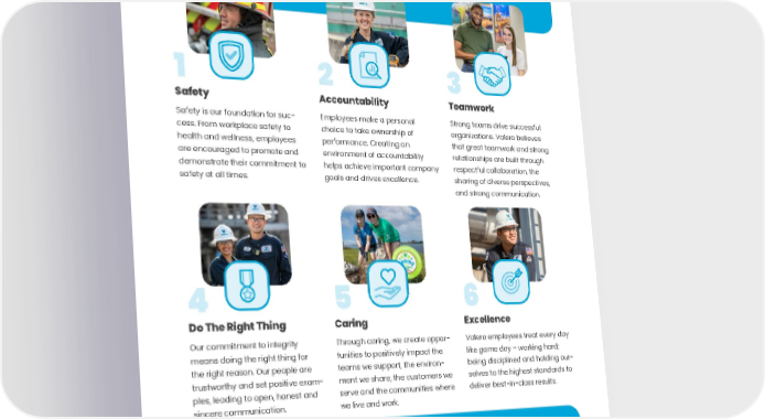 80 1 2 3 Driving Success Through Culture Our people deserve an exceptional work environment. From how we work to how we treat each other and those in our community, Valero’s long-standing and engrained cultural values act as the compass and source of inspiration for everything we do. 4 6 5 Safety Safety is our foundation for suc - cess. From workplace safety to health and wellness, employees are encouraged to promote and demonstrate their commitment to safety at all times. Accountability Employees make a personal choice to take ownership of performance. Creating an environment of accountability helps achieve important company goals and drives excellence. Teamwork Strong teams drive successful organizations. Valero believes that great teamwork and strong relationships are built through respectful collaboration, the sharing of diverse perspectives, and strong communication. Do The Right Thing Our commitment to integrity means doing the right thing for the right reason. Our people are trustworthy and set positive exam - ples, leading to open, honest and sincere communication. Caring Through caring, we create oppor - tunities to positively impact the teams we support, the environ - ment we share, the customers we serve and the communities where we live and work. Excellence Valero employees treat every day like game day – working hard; being disciplined and holding our - selves to the highest standards to deliver best-in-class results. COVID-19 The COVID-19 pandemic presented tremendous challenges to all aspects of our business in 2021. As with any other challenge, our culture values guided our response. With nearly 80% of our employees at our plants, with no option to work from home, our employees at our U.S. headquarters remained in the office in support of our operations teammates. Our safety culture allowed us to be together as a team to work collaboratively and demonstrate our leadership in the industry in delivering safe, affordable and reliable fuels as demand recovered.