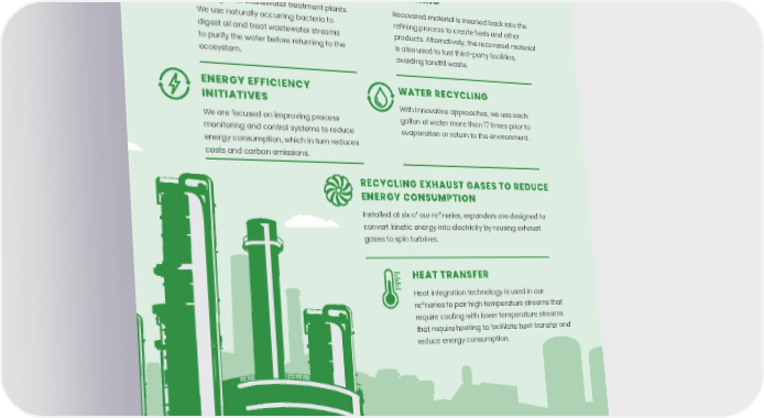 ENVIRONMENTAL, SOCIAL AND GOVERNANCE REPORT • 27 SAFETY COMMUNITY PEOPLE GOVERNANCE ENVIRONMENT REPURPOSING OF MATERIAL RECOVERED FROM TANK CLEANING Recovered material is inserted back into the refining process to create fuels and other products. Alternatively, the recovered material is also used to fuel third-party facilities, avoiding landfill waste. RECYCLING EXHAUST GASES TO REDUCE ENERGY CONSUMPTION Installed at six of our refineries, expanders are designed to convert kinetic energy into electricity by reusing exhaust gases to spin turbines. WASTEWATER MANAGEMENT Process water and stormwater are managed at wastewater treatment plants. We use naturally occurring bacteria to digest oil and treat wastewater streams to purify the water before returning to the ecosystem. WATER RECYCLING With innovative approaches, we use each gallon of water more than 17 times prior to evaporation or return to the environment. ENERGY EFFICIENCY INITIATIVES We are focused on improving process monitoring and control systems to reduce energy consumption, which in turn reduces costs and carbon emissions. HEAT TRANSFER Heat integration technology is used in our refineries to pair high temperature streams that require cooling with lower temperature streams that require heating to facilitate heat transfer and reduce energy consumption.
