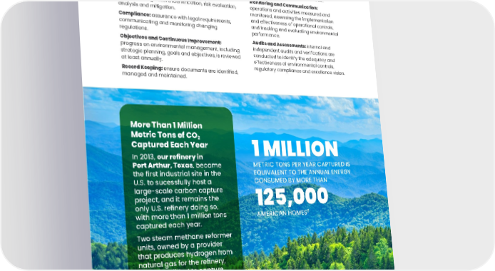 ENVIRONMENTAL, SOCIAL AND GOVERNANCE REPORT • 25 SAFETY COMMUNITY PEOPLE GOVERNANCE ENVIRONMENT Our Approach to Environmental Management 1 MILLION METRIC TONS PER YEAR CAPTURED IS EQUIVALENT TO THE ANNUAL ENERGY CONSUMED BY MORE THAN 125,000 AMERICAN HOMES 6 More Than 1 Million Metric Tons of CO 2 Captured Each Year In 2013, our refinery in Port Arthur, Texas , became the first industrial site in the U.S. to sucessfully host a large-scale carbon capture project, and it remains the only U.S. refinery doing so, with more than 1 million tons captured each year. Two steam methane reformer units, owned by a provider that produces hydrogen from natural gas for the refinery, were retrofitted to capture the carbon dioxide generated from hydrogen production. Responsibility: refinery staff dedicated to environmental excellence and risk mitigation. Risk Assessment: formal risk assessments documented, implemented and maintained at sites, including hazard identification, risk evaluation, analysis and mitigation. Compliance: assurance with legal requirements, communicating and monitoring changing regulations. Objectives and Continuous Improvement: progress on environmental management, including strategic planning, goals and objectives, is reviewed at least annually. Record Keeping: ensure documents are identified, managed and maintained. Training: ensure all employees are skilled, trained and competent to perform duties in an environmentally responsible manner. Monitoring and Communication: operations and activities measured and monitored, assessing the implementation and effectiveness of operational controls, and tracking and evaluating environmental performance. Audits and Assessments: internal and independent audits and verifications are conducted to identify the adequacy and effectiveness of environmental controls, regulatory compliance and excellence vision. 6 Source: U.S. Environmental Protection Agency (EPA) Greenhouse Gas Equivalencies Calculator.