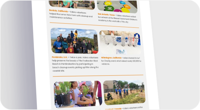 68 Benicia, California – Valero volunteers helped the Loma Vista Farm with cleanup and maintenance activities. San Antonio, Texas – Valero volunteers added fun artwork at the Blessed Sacrament Children’s Academy in the west side of the city. Pembroke, U.K. – Twice a year, Valero volunteers help preserve the beauty of the Freshwater West Beach in Pembrokeshire by participating in beach cleanup events, picking up litter along the coastal site. Wilmington, California – Valero hosted its Surf for Charity event, which raised nearly $30,000 for veterans. Corpus Christi, Texas – Every year, the Coastal Bend Bays Foundation hosts an Earth Day- Bay Day celebration in Corpus Christi, TX. This family-friendly event with educational exhibits encourages community participation in local conservation and habitat protection activities. In 2021, Valero gave away 2,600 native plants to attendees of Earth Day-Bay Day. Montreal, Canada – Valero volunteers at the Montreal East Terminal built planter boxes to grow fruits and vegetables at the Montreal East Community Gardens. With Valero’s support, the community gardens tripled in size from 4,305 to 12,916 square feet, helping to provide more fresh produce to Life of Hope Action.