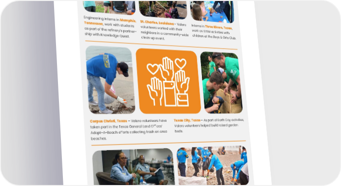 ENVIRONMENTAL, SOCIAL AND GOVERNANCE REPORT • 67 SAFETY COMMUNITY PEOPLE GOVERNANCE ENVIRONMENT St. Charles, Louisiana – Valero volunteers worked with their neighbors in a community-wide clean up event. Corpus Christi, Texas – Valero volunteers have taken part in the Texas General Land Offices’ Adopt-A-Beach efforts collecting trash on area beaches. Callao, Peru – Working together with community leaders, neighbors and the municipality, Valero volunteers helped clean the local beach by collecting 750 tons of garbage. Texas City, Texas – As part of Earth Day activities, Valero volunteers helped build raised garden beds. San Antonio, Texas – Valero volunteers partnered with the Lemonade Circle organization to provide an on-site volunteer project and learn about careers at Valero. Engineering interns in Memphis, Tennessee , work with students as part of the refinery’s partner - ship with Knowledge Quest. Interns in Three Rivers, Texas , work on STEM activities with children at the Boys & Girls Club. Stephanie Hall, Senior Vice President and Deputy General Counsel at Valero speaks about her career path to more than 100 minority girls attending this event.