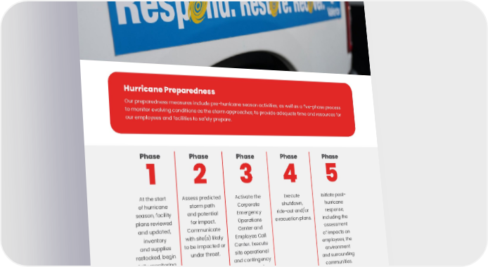 SAFETY COMMUNITY PEOPLE GOVERNANCE ENVIRONMENT ENVIRONMENTAL, SOCIAL AND GOVERNANCE REPORT • 55 Hurricane Preparedness Our preparedness measures include pre-hurricane season activities, as well as a five-phase process to monitor evolving conditions as the storm approaches, to provide adequate time and resources for our employees and facilities to safely prepare. At the start of hurricane season, facility plans reviewed and updated, inventory and supplies restocked, begin daily monitoring for potential storms. 1 2 3 4 5 Assess predicted storm path and potential for impact. Communicate with site(s) likely to be impacted or under threat. Activate the Corporate Emergency Operations Center and Employee Call Center. Execute site operational and contingency plans and prepare site(s) for storm impacts, including the staging of equipment from service providers. Execute shutdown, ride-out and/or evacuation plans. Initiate post- hurricane response, including the assessment of impacts on employees, the environment and surrounding communities. Implement plans for recovery and support for safe startup and return to operations. Phase Phase Phase Phase Phase
