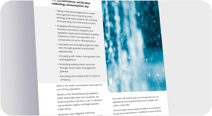 38 Water Management Water management is a critical component of our business, and we continue to work with stakeholders to improve our performance, while also reducing consumption, by: • Taking a risk-based approach to water management and integrating water strategy and water security into our long- term planning and business processes. • Engaging with local governments, industry associations, suppliers and regulatory agencies to develop innovative solutions in water management and conservation in water-stressed areas. • Assessing and managing regional water risks through updated sustainability assessments. • Complying with water management laws and regulations. • Protecting existing water resources through sound water management policies. • Recycling and reusing water to improve efficiency. Most of our water consumption takes place in our refining operations. Based on the World Resources Institute’s (WRI) Water Risk Atlas tool, Aqueduct, we determined that only two of our 15 refineries are located in regions with high baseline water stress. Reduction and mitigation initiatives include the evaluation of reused municipal wastewater for cooling tower purposes and acquisition of secured water rights. Water scarcity can be a risk not only to communities but to the refining process. Water is needed for cooling and also in the form of steam for heating. In addition, water plays an important role in processing feedstocks. 9 Source: Water Footprint Calculator. Our water-risk-based approach is integrated into our operational and long-term planning to mitigate and reduce water risks. We have taken several steps we believe are necessary to secure our operations in conditions of water scarcity. • At our Wilmington refinery , we have secured treated municipal wastewater to supplement our cooling tower makeup water. Upon project completion, we expect to save up to 420 million gallons of potable water per year. That is roughly the annual amount consumed by 9,000 U.S. households. 9