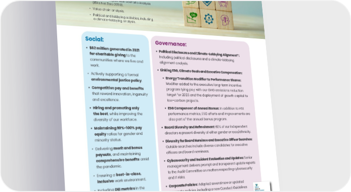 ENVIRONMENTAL, SOCIAL AND GOVERNANCE REPORT • 11 We often update our ESG reports and disclosures. The latest versions are available on our website at www.valero.com > Investors > ESG. Upcoming ESG Disclosures • 2022 TCFD Report with Scenario Analysis (IEA's Net Zero 2050). • Value chain analysis. • Political and lobbying activities, including a climate-lobbying analysis. Social: • $62 million generated in 2021 for charitable giving to the communities where we live and work. • Actively supporting a formal environmental justice policy . • Competitive pay and benefits that reward innovation, ingenuity and excellence. • Hiring and promoting only the best , while improving the diversity of our workforce. • Maintaining 99%-100% pay equity ratios for gender and minority status. • Delivering merit and bonus payouts , and maintaining comprehensive benefits amid the pandemic. • Ensuring a best-in-class, inclusive work environment. • Including DEI metrics in the strategic portion of annual bonus. • Enhancing personal and professional growth and development opportunities to enable all employees to reach their full potential. • Publishing EEO-1 Report* on an annual basis (see page 110). Governance: • Political Disclosures and Climate-Lobbying Alignment*: Including political disclosures and a climate-lobbying alignment analysis. • Linking ESG, Climate Goals and Executive Compensation: • Energy Transition Modifier to Performance Shares: Modifier added to the executive long-term incentive program tying pay with our GHG emissions reduction target for 2025 and the deployment of growth capital to low-carbon projects. • ESG Component of Annual Bonus: In addition to HSE performance metrics, ESG efforts and improvements are also part of the annual bonus program. • Board Diversity and Refreshment: 60% of our independent directors represent diversity of either gender or race/ethnicity. • Diversity for Board Nominee and Executive Officer Searches: Outside searches include diverse candidates for executive officers and board nominees. • Cybersecurity and Incident Evaluation and Updates: Senior management delivers prompt and transparent update reports to the Audit Committee on matters respecting cybersecurity and IT risks. • Corporate Policies: Adopted several new or updated corporate policies, including a new Conduct Guidelines for Business Partners. • Enhanced Training and Communications: Valero’s compliance program includes mandatory training for all employees on our Code of Business Conduct and Ethics, a comprehensive compliance communications program and an ethics helpline and interactive website for online reporting. *These reports are produced annually.