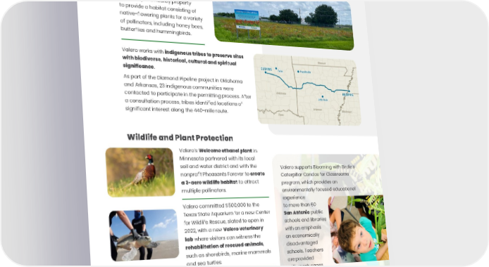 ENVIRONMENTAL, SOCIAL AND GOVERNANCE REPORT • 33 SAFETY COMMUNITY PEOPLE GOVERNANCE ENVIRONMENT Wildlife and Plant Protection Our Meraux refinery created a 15,000-square-foot wildflower sanctuary in a nearby property to provide a habitat consisting of native-flowering plants for a variety of pollinators, including honey bees, butterflies and hummingbirds. Valero works with indigenous tribes to preserve sites with biodiverse, historical, cultural and spiritual significance . As part of the Diamond Pipeline project in Oklahoma and Arkansas, 23 indigenous communities were contacted to participate in the permitting process. After a consultation process, tribes identified locations of significant interest along the 440-mile route. Valero supports Blooming with Birdie's Caterpillar Condos for Classrooms program, which provides an environmentally focused educational experience to more than 60 San Antonio public schools and libraries with an emphasis on economically disadvantaged schools. Teachers are provided with mesh cages, milkweed plants and two caterpillars, accompanied by virtual lessons that align with the metamorphosis of the monarch butterfly. Valero’s Welcome ethanol plant in Minnesota partnered with its local soil and water district and with the nonprofit Pheasants Forever to create a 3-acre wildlife habitat to attract multiple pollinators. Valero committed $500,000 to the Texas State Aquarium for a new Center for Wildlife Rescue, slated to open in 2022, with a new Valero veterinary lab where visitors can witness the rehabilitation of rescued animals , such as shorebirds, marine mammals and sea turtles. As part of the construction of a cogeneration unit at our refinery in Pembroke , an abandoned residence was converted into habitat for local populations of bats relocated because of the new unit. The bat house has attracted a number of bats.
