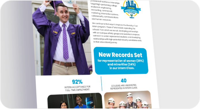 84 40 COLLEGES AND UNIVERSITIES REPRESENTED IN INTERN CLASS. Fueling Exceptional Futures For 24 years, the Valero Intern Program has grown into our primary recruiting vehicle for our professional workforce. Internships target high-performing college students in engineering, accounting, commercial, marketing, information systems, cybersecurity, communications and human resources. We continue to find ways to improve the diversity of our intern program. These efforts include expanding the schools from which we recruit; developing partnerships with on-campus affinity groups and societies to improve outreach to under-represented students; and developing relationships with high-potential minority candidates early in their educational journey. New Records Set for representation of women (39%) and minorities (34%) in our Intern Class. 92% INTERN ACCEPTANCE FOR FULL-TIME EMPLOYMENT.