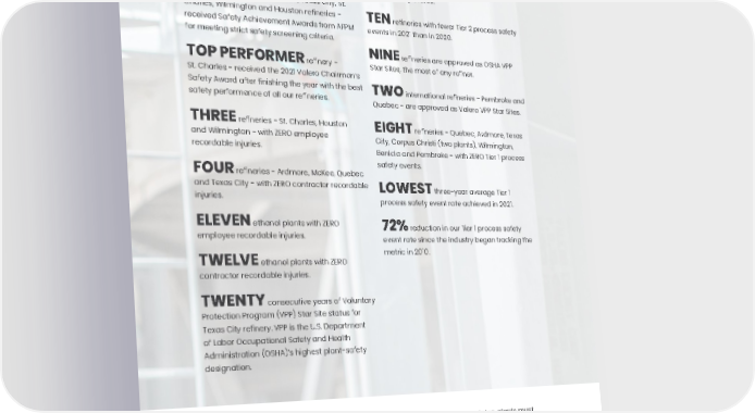 SAFETY COMMUNITY PEOPLE GOVERNANCE ENVIRONMENT ENVIRONMENTAL, SOCIAL AND GOVERNANCE REPORT • 43 TEN manufacturing facilities - Wilmington Asphalt Plant and Ardmore, Benicia, Corpus Christi (two plants), Three Rivers, Texas City, St. Charles, Wilmington and Houston refineries - received Safety Achievement Awards from AFPM for meeting strict safety screening criteria. TOP PERFORMER refinery - St. Charles - received the 2021 Valero Chairman’s Safety Award after finishing the year with the best safety performance of all our refineries. THREE refineries - St. Charles, Houston and Wilmington - with ZERO employee recordable injuries. FOUR refineries - Ardmore, McKee, Quebec and Texas City - with ZERO contractor recordable injuries. ELEVEN ethanol plants with ZERO employee recordable injuries. TWELVE ethanol plants with ZERO contractor recordable injuries. TWENTY consecutive years of Voluntary Protection Program (VPP) Star Site status for Texas City refinery. VPP is the U.S. Department of Labor Occupational Safety and Health Administration (OSHA)’s highest plant-safety designation. To achieve VPP Star Site status, plants must demonstrate that enhanced safety systems have been implemented and embraced in a collaborative way by site leaders and employees. Sites are reassessed by OSHA every three to five years in order to maintain their VPP status. ELEVEN ethanol plants had ZERO Tier 1 process safety events. TEN refineries with fewer Tier 2 process safety events in 2021 than in 2020. NINE refineries are approved as OSHA VPP Star Sites, the most of any refiner. TWO international refineries - Pembroke and Quebec - are approved as Valero VPP Star Sites. EIGHT refineries - Quebec, Ardmore, Texas City, Corpus Christi (two plants), Wilmington, Benicia and Pembroke - with ZERO Tier 1 process safety events. LOWEST three-year average Tier 1 process safety event rate achieved in 2021. 72% reduction in our Tier 1 process safety event rate since the industry began tracking the metric in 2010.