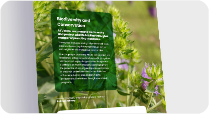 30 Biodiversity and Conservation At Valero, we promote biodiversity and protect wildlife habitat through a number of proactive measures. We engage in diverse ecological projects with local, state and federal regulatory agencies, as well as with neighbors and indigenous communities. Our campaigns promoting wildlife conservation and biodiversity enhancement include working together with local and regional organizations that provide a variety of environmental services ranging from the protection of endangered species, restoration of wetlands and reforestation to rehabilitation of former industrial sites, and promoting environmental awareness through educational programs. Monarch butterfly way station planting near our Ardmore refinery . Valero became a member of the Wildlife Habitat Council, a nonprofit dedicated to enhancing and restoring wildlife habitat by promoting investments in sustainability efforts, increasing employee involvement and engagement with communities.