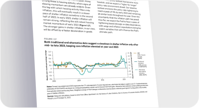 As we discussed earlier, monetary policy and inflation and a slowdown in wages as a tighter the communications from policymakers have policy rate environment begins showing its full squarely focused on inflation, and policy rates are effect on the economy in 2023. currently at levels broadly considered restrictive for economic activity, with more likely in coming Given such price and labor dynamics of late, quarters. That said, we’re starting to see signs our monetary policy outlook has become more of progress in the fight against inflation. Prime hawkish, and we expect a “higher for longer” among these is housing activity, where signs of policy rate environment ahead. Our baseline slowing momentum are already evident. Given outlook envisions the policy rate tightening to the lag with which housing activity filters into reach a peak of 5% by early 2023 and remaining inflation, this will eventually result in a slower at similar levels throughout the year. Given the pace of shelter inflation sometime in the second uncertainty that the inflation path has posed half of 2023. In early 2023, shelter inflation will thus far, we expect the Fed to favor a pace of remain strong, reflecting the still-robust housing tightening based strongly on data dependence, market momentum of early 2022 (Figure I-17). with wage and inflation expectations being key The stronger gains in shelter inflation, in our view, watch variables that will influence the Fed’s will be offset by a faster deceleration in goods ultimate path. FIGURE I-17 Both traditional and alternative data suggest a slowdown in shelter inflation only after mid- to late 2023, keeping core inflation elevated at year-end 2023 OER hange‚ hange (LHS, -mont c c average, ge ge MoM%) a a t t en en Traditional c € c indicators per per (LHS, estimate h h t t of OER MoM%) mon mon - - Alternative er– – er data leading v v o o - - indicators h–€ – h t t (RHS, MoM%) n n o– – o M ƒ M Notes: Owners’ equivalent rent (OER) represents the CPI subcomponent of owner-imputed rent, which holds the highest weight in core CPI. Traditional indicator estimates of OER MoM% are based on a Vanguard proprietary model used to forecast OER MoM gains. Alternative data indicators contain publicly provided data from private rental and housing firms. Weighted average of MoM changes in alternative data has been a relatively good signal of turning points in the monthly pace of shelter inflation. Sources: Vanguard calculations, based on data from Zillow, Apartment List, the Bureau of Labor Statistics, the U.S. Bureau of Economic Analysis, Refinitiv, and Moody’s, as of October 31, 2022. 22