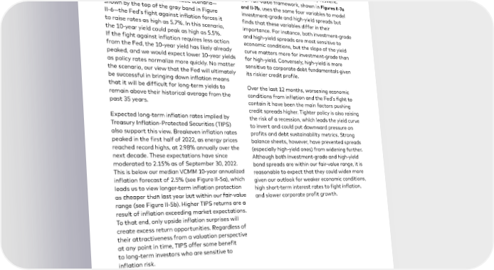 In our baseline scenario—in which inflation falls Corporate bonds: Cheaper valuations, throughout 2023 but remains above the Fed’s but downside risks remain 2% target and the federal funds rate rises to Despite a record pace of Fed tightening and 4.5% and stays there for the next 12 months a historic rise in Treasury yields in 2022, credit before gradually falling to 2.5%—we expect the spreads have remained remarkably resilient. 10-year yield to peak around its recent highs Our fair-value framework, shown in Figures II-7a (4%–4.3%). In a more pessimistic scenario— and II-7b, uses the same four variables to model shown by the top of the gray band in Figure investment-grade and high-yield spreads but II-6—the Fed’s fight against inflation forces it finds that these variables differ in their to raise rates as high as 5.7%. In this scenario, importance. For instance, both investment-grade the 10-year yield could peak as high as 5.5%. and high-yield spreads are most sensitive to If the fight against inflation requires less action economic conditions, but the slope of the yield from the Fed, the 10-year yield has likely already curve matters more for investment-grade than peaked, and we would expect lower 10-year yields for high-yield. Conversely, high-yield is more as policy rates normalize more quickly. No matter sensitive to corporate debt fundamentals given the scenario, our view that the Fed will ultimately its riskier credit profile. be successful in bringing down inflation means that it will be difficult for long-term yields to Over the last 12 months, worsening economic remain above their historical average from the conditions from inflation and the Fed’s fight to past 35 years. contain it have been the main factors pushing credit spreads higher. Tighter policy is also raising Expected long-term inflation rates implied by the risk of a recession, which leads the yield curve Treasury Inflation-Protected Securities (TIPS) to invert and could put downward pressure on also support this view. Breakeven inflation rates profits and debt sustainability metrics. Strong peaked in the first half of 2022, as energy prices balance sheets, however, have prevented spreads reached record highs, at 2.98% annually over the (especially high-yield ones) from widening further. next decade. These expectations have since Although both investment-grade and high-yield moderated to 2.15% as of September 30, 2022. bond spreads are within our fair-value range, it is This is below our median VCMM 10-year annualized reasonable to expect that they could widen more inflation forecast of 2.5% (see Figure II-5a), which given our outlook for weaker economic conditions, leads us to view longer-term inflation protection high short-term interest rates to fight inflation, as cheaper than last year but within our fair-value and slower corporate profit growth. range (see Figure II-5b). Higher TIPS returns are a result of inflation exceeding market expectations. To that end, only upside inflation surprises will create excess return opportunities. Regardless of their attractiveness from a valuation perspective at any point in time, TIPS offer some benefit to long-term investors who are sensitive to inflation risk. 43
