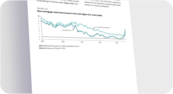 With the implementation of the EPG and higher large proportion of U.K. mortgagers are on fixed interest rates, we expect the narrative of the rates, it will take time for this effect to feed U.K.’s “cost-of-living” crisis to shift away from through to the economy. That said, we estimate higher energy prices and toward higher mortgage that 35% to 45% of the total stock of U.K. interest payments. If the Bank Rate does reach mortgages will be repriced to newer rates over 4.5%, this would imply new mortgage rates of the course of 2023. This will further weaken the at least 5.5% for the average borrower—a near- outlook for the consumer and exert downward quadrupling of interest costs (Figure I-22). As a pressure on housing valuations. FIGURE I-22 New mortgage rates have moved in line with higher U.K. bond yields % -year fixed mortgage rate -year gilt yield – Note: Monthly data from January 31, 2000, to September 30, 2022. Source: Bloomberg, as of October 21, 2022. 28