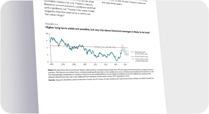 U.S. interest rates: Valuations are attractive The evolution of fair value will depend heavily After rising by as much as 260 basis points in on the direction of inflation, the Fed’s response, 2022, the 10-year U.S. Treasury yield has traded and the market’s expectations for future policy in a range of 3.7%–4.3% as the market tries to rates. Figure II-6 shows the expected impact of ascertain the direction of Fed policy. But we our economics team’s inflation and federal funds believe that the terminal rate and the amount rate forecast on the 10-year Treasury yield over of time policy is held at that level will be what the next three years. ultimately matters for U.S. Treasury returns. Based on current economic conditions and Fed policy guidance, our Treasury fair-value model suggests that the yield curve is within our 9 fair-value range. FIGURE II-6 Higher long-term yields are possible, but any trip above historical averages is likely to be brief % erage -year yied – Projected range of 10-year Treasury yied 10-year Treasury yied 10-year Treasury yied rojected ase case€ Notes: The chart shows the actual 10-year Treasury yield quoted on a constant maturity basis since 1995 and Vanguard’s forecast based on a range of economic scenarios. The forecasts are derived from a statistical model specification that is a five-variable vector error correction model, including the 10-year Treasury yield, first three principal components of covariance matrix for 10-year trailing inflation, 10-year trailing food inflation, the 10-year trailing hourly earnings growth, effective federal funds rate, and 5-year trailing real GDP estimated over the period January 1979–September 30, 2022. Sources: Vanguard calculations, based on data from FactSet, the U.S. Bureau of Labor Statistics, the Federal Reserve Board, Refinitiv, and Global Financial Data. 9 For more details on our Treasury attribution model, see Davis et al., 2021. 42