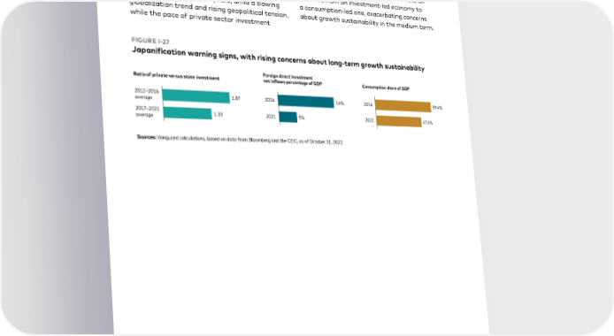 In addition to policymakers’ reluctance to slowed notably over the same time frame overstimulate, a worsening structural growth (Figure I-27). These developments will weigh outlook is expected to restrain the recovery in on productivity growth, a key determinant of 2023 and the growth outlook in the years ahead. potential growth rates. Also concerning is that Foreign direct investment flows into China over progress has reversed during the pandemic on 2017–2021 were significantly lower than they the shift from an investment-led economy to had been in the prior five years, amid a slowing a consumption-led one, exacerbating concerns globalization trend and rising geopolitical tension, about growth sustainability in the medium term. while the pace of private sector investment FIGURE I-27 Japanification warning signs, with rising concerns about long-term growth sustainability Foreign direct investment Ratio of private versus state investment net inflows percentage of GDP Consumption share of GDP – . % .% average – . % .% average Sources: Vanguard calculations, based on data from Bloomberg and the CEIC, as of October 31, 2022. 33