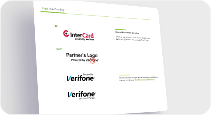 Partner’s Logo Powered by Don’t Do Internal Partners Co-Branding When co-branding with other internal partners, set Verifone in type rather than using Verifone’s logo. Powered by Verifone logo and Verifone Approved Partner logo are available at: http://bit.ly/poweredbyverifone Logo | Co-Branding
