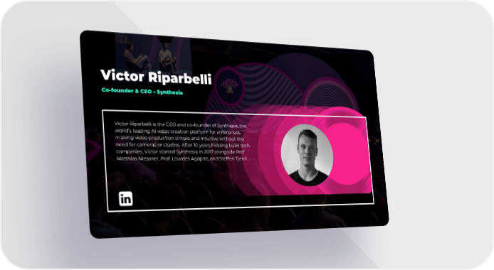 Victor Riparbelli Co-founder & CEO • Synthesia Victor Riparbelli is the CEO and co-founder of Synthesia, the world’s leading AI video creation platform for enterprises, making video production simple and intuitive without the need for cameras or studios. After 10 years helping build tech companies, Victor started Synthesia in 2017 alongside Prof. Matthias Niessner, Prof. Lourdes Agapito, and Steffen Tjerril.