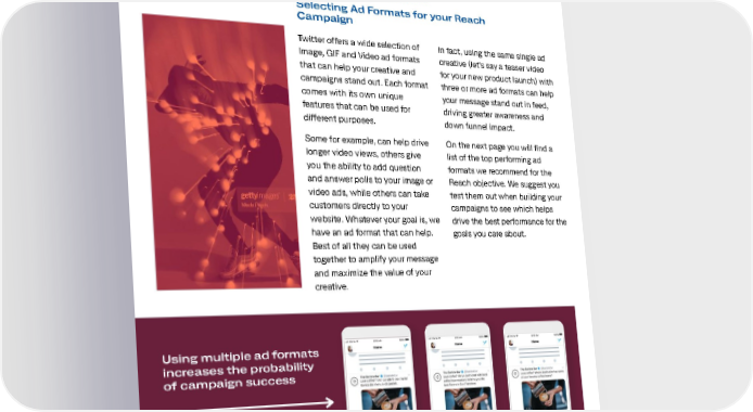 Video ad formats Recommendations Selecting Ad Formats for your Reach Campaign Twitter offers a wide selection of In fact, using the same single ad Image, GIF and Video ad formats creative (let's say a teaser video that can help your creative and for your new product launch) with campaigns stand out. Each format three or more ad formats can help comes with its own unique your message stand out in feed, features that can be used for driving greater awareness and different purposes. down funnel impact. Some for example, can help drive On the next page you will find a longer video views, others give list of the top performing ad you the ability to add question formats we recommend for the and answer polls to your image or Reach objective. We suggest you video ads, while others can take test them out when building your customers directly to your campaigns to see which helps website. Whatever your goal is, we drive the best performance for the have an ad format that can help. goals you care about. Best of all they can be used together to amplify your message and maximize the value of your creative. Using multiple ad formats increases the probability of campaign success When possible use Ad Formats to drive 3+the best results 06
