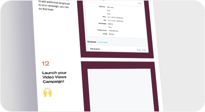 How to get started 11 Review your final campaign setup on the "Review & Complete" tab. If you'd like to add additional ad groups to your campaign, you can do that here. 12 Launch your Video Views Campaign! 26