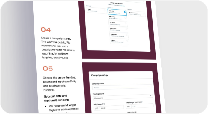 How to get started 03 Choose "Video Views" from the list of campaign objectives. 04 Create a campaign name. This won’t be public. We recommend you use a descriptive name for ease in reporting, ie: audience targeted, creative, etc. 05 Choose the proper Funding Source and input your Daily and Total campaign budgets. Set start date and (optional) end date. • We recommend longer flights to achieve greater CPV efficiencies. Set parameters for your ad group(s). • Ensure to only select “Accelerated Pacing” if you have a very short flight with more flexible cost ranges 22