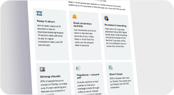Video creative best practices Creative best practices After reviewing thousands of campaigns, we’ve put together a list of ways you can drive the best return for your ads. Keep in mind, people also read text on Twitter (more so than other platforms) so it’s important to think through your copy and CTAs as well. Keep it short Grab attention Persistent branding Aim to keep videos at 15 quickly Video ads with clear logo seconds or less to Use movement and show placement drive 36% higher maximize branding impact. talent in the first few brand recall. Clear branding 15 second video ads tend seconds of your video. should be included within to see 3x higher Keep in mind that the the first 3 seconds of the completion rates over 30 video can be skipped ad, but preferably stay on- second ads. after 6 seconds. screen the whole time. Strong visuals Captions + sound Short Copy 97% of people focus on off 90% of people read copy visuals on Twitter, so make Include captions or text- on Twitter. The sweet spot sure it’s eye-catching and overlay so that your are Tweets with 50-100 features your product or message comes through characters. key message. without sound. Closed captions and text overlays create 28% longer view times on Twitter and Average ROI is 1.8x higher for videos that don’t require sound to be understood. 13
