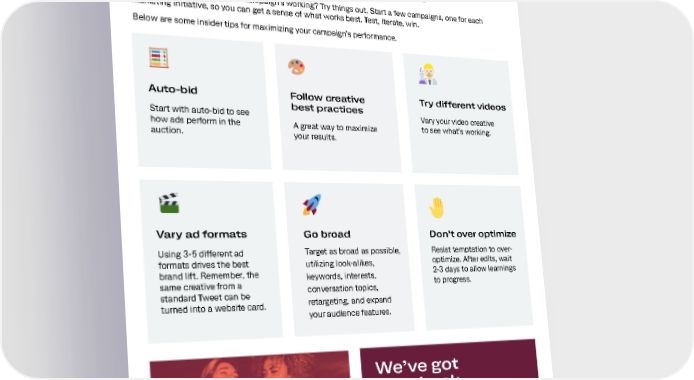 Campaign Pro Tips The best way to know if your campaign’s working? Try things out. Start a few campaigns, one for each marketing initiative, so you can get a sense of what works best. Test, iterate, win. Below are some insider tips for maximizing your campaign’s performance. Auto-bid Follow creative Try different videos Start with auto-bid to see best practices Vary your video creative how ads perform in the A great way to maximize to see what’s working. auction. your results. Vary ad formats Go broad Don’t over optimize Using 3-5 different ad Target as broad as possible, Resist temptation to over- formats drives the best utilizing look-alikes, optimize. After edits, wait brand lift. Remember, the keywords, interests, 2-3 days to allow learnings same creative from a conversation topics, to progress. standard Tweet can be retargeting, and expand turned into a website card. your audience features. We’ve got your back. Our systems will automatically serve your best performing ads to the people you want to see them. Plus, we’re here to talk campaign strategy and effective ways to reach your key demo. 20