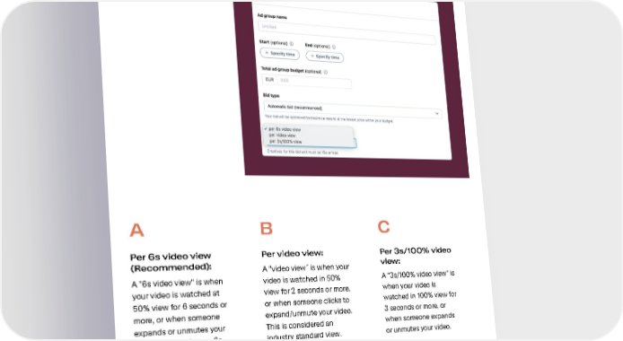 How to get started 08 Select the bid unit you'd like to use in your campaign: A B C Per 6s video view Per video view: Per 3s/100% video (Recommended): A "video view" is when your view: A "6s video view" is when video is watched in 50% A "3s/100% video view" is your video is watched at view for 2 seconds or more, when your video is 50% view for 6 seconds or or when someone clicks to watched in 100% view for more, or when someone expand/unmute your video. 3 seconds or more, or expands or unmutes your This is considered an when someone expands video. Retargeting on 6s industry standard view. or unmutes your video. video views is not yet available. 24