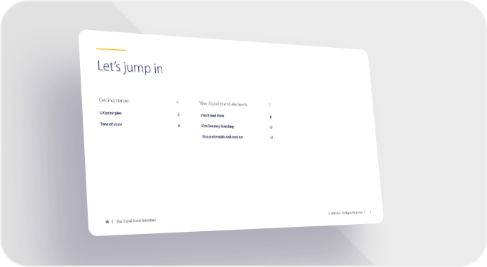 Let’s jump in Getting started 4 Visa digital brand elements 7 UX principles 5 Visa Brand Mark 8 Tone of voice 6 Visa Sensory Branding 12 Visa credentials and card art 17 0 Visa Digital Brand Guidelines © 2018 Visa. All Rights Reserved. 3