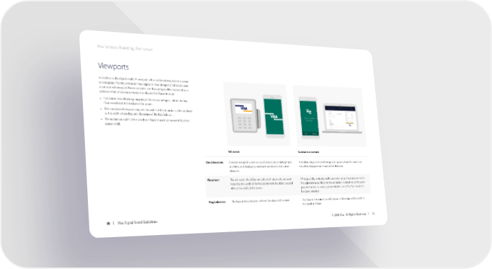 Visa Sensory Branding: Animation Viewports A window to the digital world. A viewport is the visible viewing area of a screen or web page. The Visa animation may appear in two viewports: full screen or in a constrained viewport. Please consider user flow and possible devices of your solution when choosing a viewport to display the Visa animation. • Full screen should take up majority of the device viewport, where the Visa flags would exit at the edge of the screen. • The constrained viewport requires the width of the animation to be confined to the width of one flag, and the edges of the flag fade out. You sent $100 to Alex Miller • The maximum width of the Visa Brand Mark should not exceed 40% of the screen width. Done Send more Full screen Constrained viewport Considerations Consider using full screen on small devices, like mobile phones Consider using constrained viewport in spaces where the animation or tablets, and displaying a minimal number of other screen would be displayed with many other elements. elements. Placement The animation should be vertically and horizontally centered. When possible, vertically and horizontally center the animation within Note that the width of the Visa Brand Mark should not exceed the applicable area. Place the Visa animation in proximity to the user’s 40% of the width of the screen. payment action, i.e. near payment details or on a “Pay” button after it has been selected. Flag behaviors The flags in the animation will exit the edge of the screen. The flags in the animation will fade out at the edges of the width of the Visa Brand Mark. Visa Digital Brand Guidelines © 2018 Visa. All Rights Reserved. 15