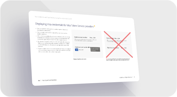 Visa Credentials and Card Art: Displaying Visa credentials Cont’d Displaying Visa credentials for Visa Token Service providers* • Card art is required for wallet applications participating in Visa Token Service that facilitate in-store payments. • Card art is highly recommended to represent Visa credentials in most Visa payment experiences. • When card art is unavailable, the card must be rendered using the color scheme Digital account number Visa....1234 Token number: Visa....1234 provided by Visa (on behalf of the issuer) along with the Visa brand mark, to be When you pay with this device, this number is used instead When you pay with this device, this number is used instead reviewed and approved by Visa as part of the solution approval process. of your card number to protect your information of your card number to protect your information • The consumer is required to have access to the last 4 digits of the token or the “digital account number,” along with a description explaining how the digital account number represents the consumer’s card number for a more secure transaction. Digital account number ? When you pay with this device, Digital account number Visa....1234 • During the payment process, the minimum information that must be displayed this number is used instead of Visa....1234 your card number to protect to the user includes an image of the front of the card as well as the last 4 digits your information. of the account number to be used for the transaction. Display of digital account number Do not use the word “token” to describe the token number, and do not render the digital account number without a description of what it is Visa Digital Brand Guidelines © 2018 Visa. All Rights Reserved. 19