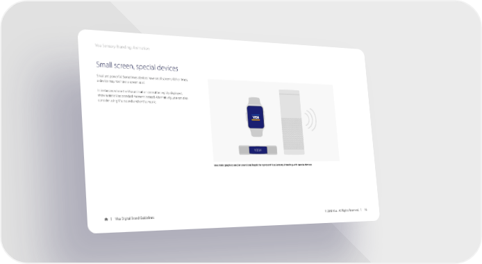 Visa Sensory Branding: Animation Small screen, special devices Small yet powerful. Sometimes devices have small screens. Other times, a device may not have a screen at all. In instances where the Visa animation cannot be legibly displayed, show a static Visa branded moment instead. Alternatively, you can also consider using Visa sound and/or Visa haptic. Use static graphics and/or sound and haptic to represent Visa Sensory Branding with special devices Visa Digital Brand Guidelines © 2018 Visa. All Rights Reserved. 16