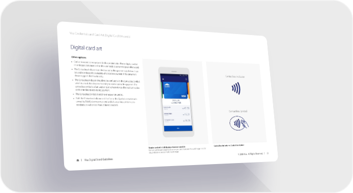 Visa Credentials and Card Art: Digital Card Art cont’d Digital card art Other options • Card art is easiest to recognize in landscape orientation. Please display card art in landscape at moments when the user needs to acknowledge or select a card. • The Contactless Indicator icon denotes contactless payment capabilities. It can Contactless Indicator be used to indicate the availability of contactless payment if the consumer’s device supports that functionality. • The Contactless Indicator should not be confused with the Contactless Symbol, which is a mark that denotes the ability to receive contactless payment. The contactless symbol is often used on point-of-sale devices that read contactless cards or mobile devices during payment. • The Contactless Symbol should never appear on card art. • Both the Contactless Indicator and the Contactless Symbol are trademarks owned by EMVCo (www.emvco.com) and all usage must conform to its standards, as well as Visa Product Brand Standards. Contactless Symbol Render card art in full display whenever possible Contactless Indicator vs. Contactless Symbol Partical card image is applicable as long as users have seen the card image in its full size, and able to access the full card image Visa Digital Brand Guidelines © 2018 Visa. All Rights Reserved. 21