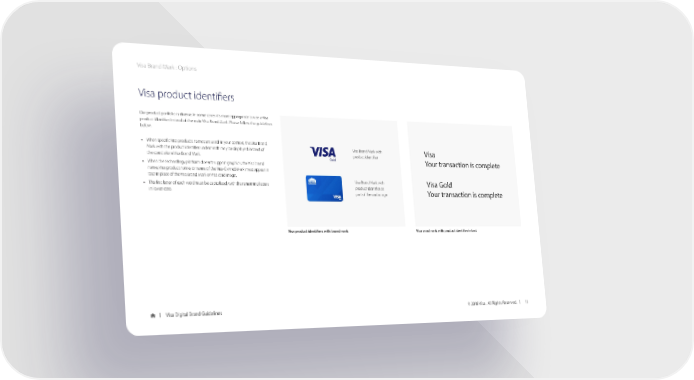 Visa Brand Mark : Options Visa product identifiers Our product portfolio is diverse. In some cases it’s more appropriate to use a Visa product identifier instead of the main Visa Brand Mark. Please follow the guidelines below. • When specific Visa products names are used in your context, the Visa Brand Mark with the product identifier underneath may be displayed instead of Visa Brand Mark with Visa the stand alone Visa Brand Mark. product identifier Gold Your transaction is complete • When the technollogy platform doesn’t support graphics, the Visa brand name, Visa product name, or name of the Visa-Owned Mark must appear in text in place of the Visa Brand Mark or Visa card image. • The first letter of each word must be capitalized, with the remaining letters Visa Brand Mark with Visa Gold in lower case. product identifier as part of the card image Your transaction is complete Visa product identifiers with brand mark Visa word mark with product identifier in text Visa Digital Brand Guidelines © 2018 Visa. All Rights Reserved. 11