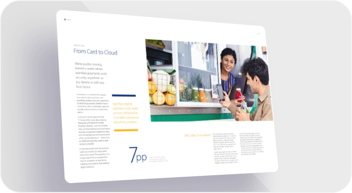 006 007 TREND #01 From Card to Cloud We’re quickly moving toward a world where seamless payments work securely, anywhere on any device or with any form factor. Innovation in commerce has always been about reducing friction and providing a better consumer experience. As technology evolves whether it be to Seamless digital contactless cards or wearables, payment payments only need security and convenience must evolve with it. account information Consumers spend approximately to enable commerce 11 hours online every day, enjoying anywhere, anytime. the power of “instantism” at their fingertips (Nielsen, June 2016). When they can find anything they need within seconds, the payment experience slips into the background and becomes part Visa has enabled the growth of merchant- And now, for merchants eager to harness of the overall experience—rather than QR Codes Everywhere presented QR code payments in 15 countries the power of QR code payments, the Visa an additional step they need to seek around the world with its innovative mobile Ready Program has adopted interoperable QR out and complete. payments solution, mVisa, which allows standards to develop tools and capabilities consumers to pay for goods and services that help ease generation and deployment of In this new world, think of consumer by scanning a QR code on a smartphone or QR codes and merchant numbers by banks, credit not in terms of cards, but in entering a merchant number into their processors, and merchant aggregators. Once terms of accounts. The question is no feature phones. enrolled, merchants can accept payments from Payment goes straight from the consumer’s any country or bank, knowing that Visa will longer where Visa is accepted, but Visa account into the merchant’s account and efficiently process transacations in accordance how it’s accepted: via any device, Usage of online and mobile- with Visa's security standards. pponly banks has increased 7 pp provides near real-time notification to both meeting consumers in their existing 7 (or percentage points) since 2016. parties. mVisa is completely interoperable, digital hangouts. bringing the same convenience, security, and reliability provided by the trusted Visa brand.